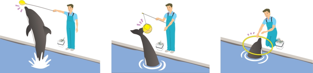 トレーニングには笛と餌を用います。笛は OK の合図、餌は褒めるのに使うご褒美です。トレーナーはイルカの行動の中から目標とする動きに近いものを選び、繰り返し褒めます。この場合の「褒める」とは、行動直後に笛を吹いて餌を与えることです。褒められた行動は出やすくなります。ひとつの種目完成には、行動をステップに分けたり道具を使用したり様々に工夫しながらも基本的には褒めて育てていきます。