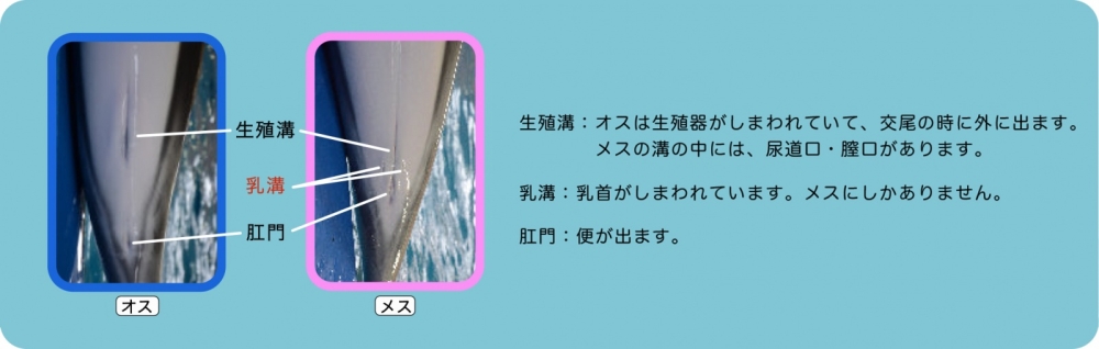 ハンドウイルカやカマイルカはお腹にある溝を見るとオスとメスを見分けることができます。生殖溝の両脇に乳溝があるのはメス、ないのはオスです。