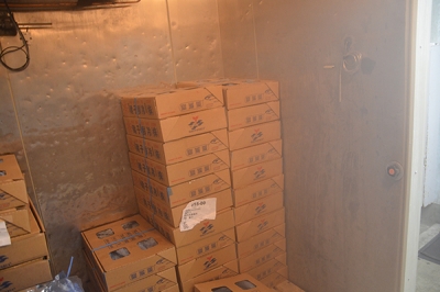 野生のハンドウイルカやカマイルカは様々な種類の魚やイカを捕食します。ハンドウイルカ一頭が一日に食べる餌の量は約 10 ㎏で、マサバでは約 70 尾に相当します。マリンピア日本海では、コストや栄養面、安定した入手の持続などを考慮して魚種を選択しています。餌は、年間通し安定して与えるため、魚種の漁期に合わせて 1 年分購入し、冷凍保管します。凍結により寄生虫感染の心配はなくなりますが、解凍時にビタミン類が流出してしまう為、与える際はビタミン剤を添加しています。
