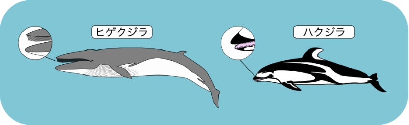 クジラは口内の様子で大きく2つに分けられ、“ヒゲ板”を持つ「ヒゲクジラ」、歯を持つ「ハクジラ」にわけられます。「イルカ」は体長がおよそ4メートル以下の「ハクジラ」を指しますが、基準が曖昧で、○○イルカとされない場合があります。