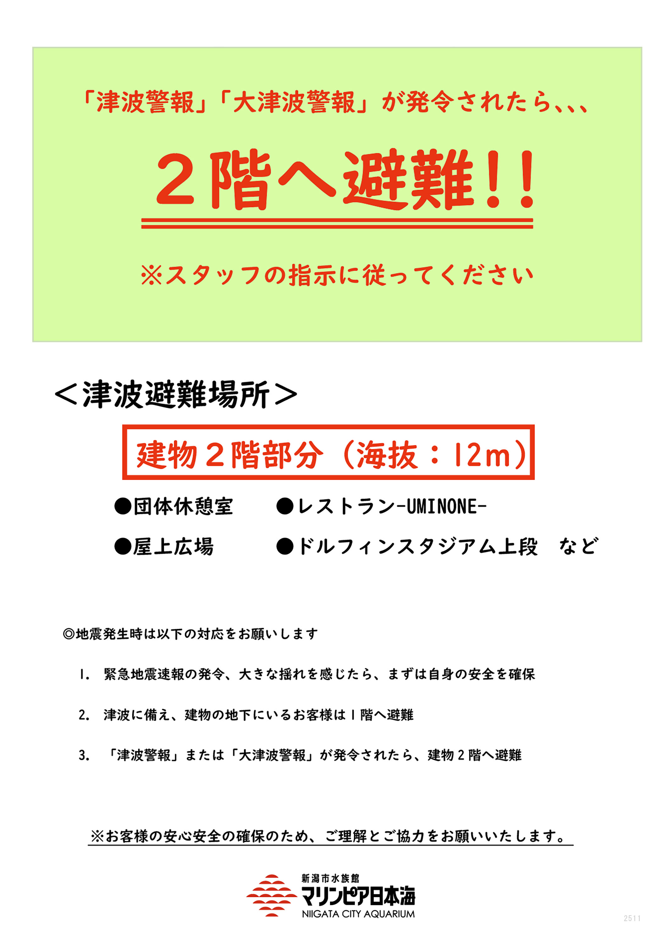 3. 「津波警報」または「大津波警報」が発令されたら、建物2階へ避難