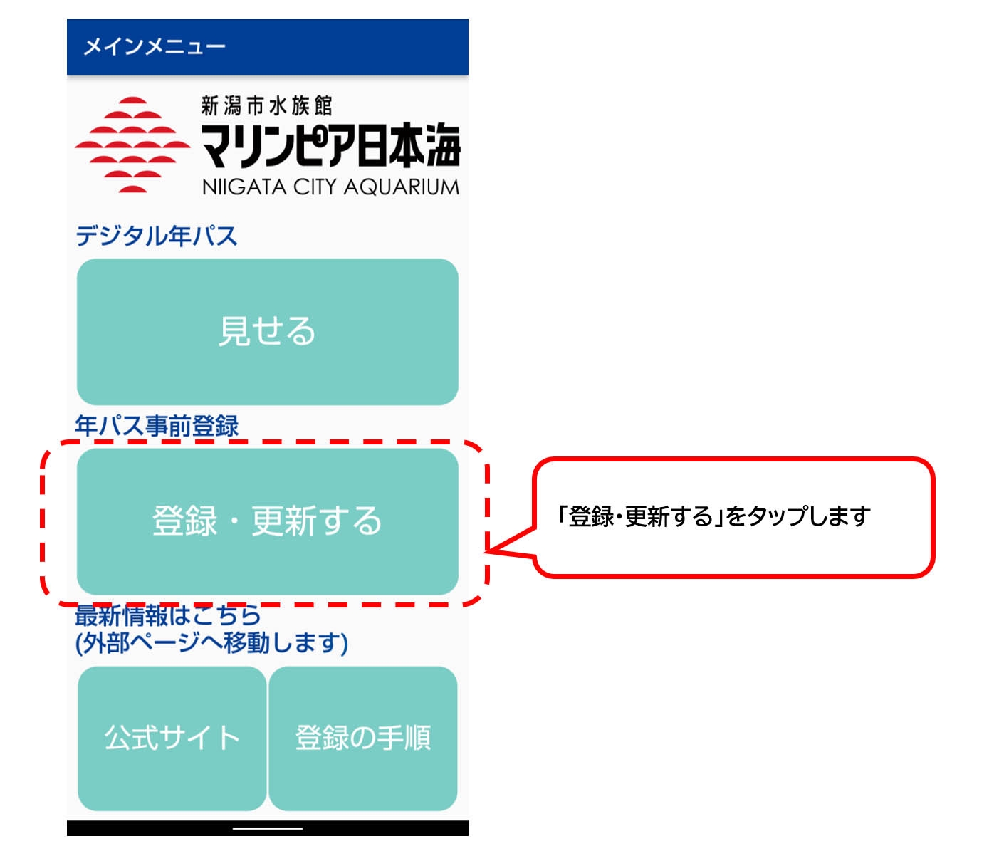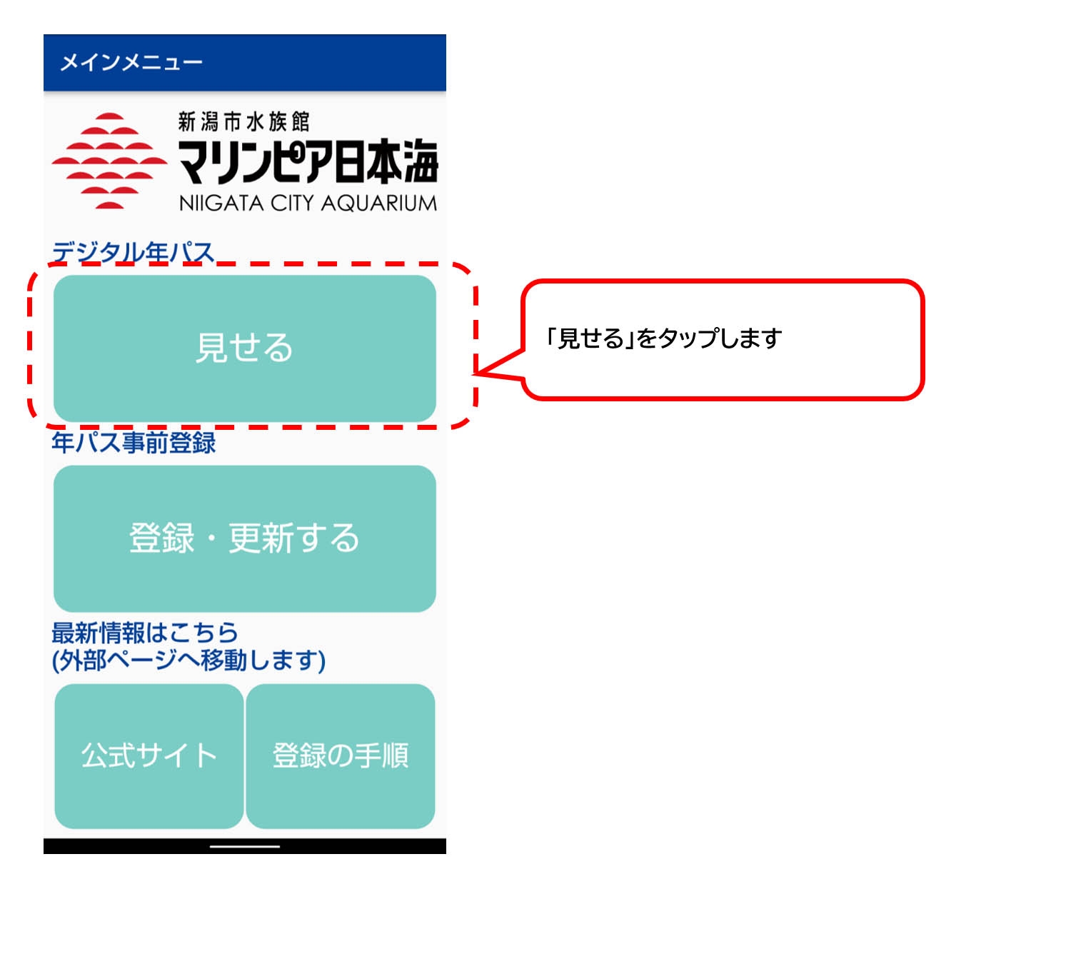 以下のリンクから「マリンピア日本海 年間パスポートアプリ」を取得します。