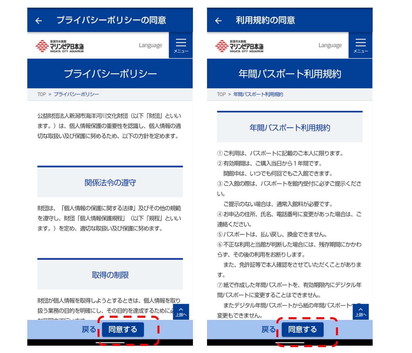 (2)「プライバシーポリシー」「個人情報の取り扱い」の内容を確認し、「同意する」をタップしてください。