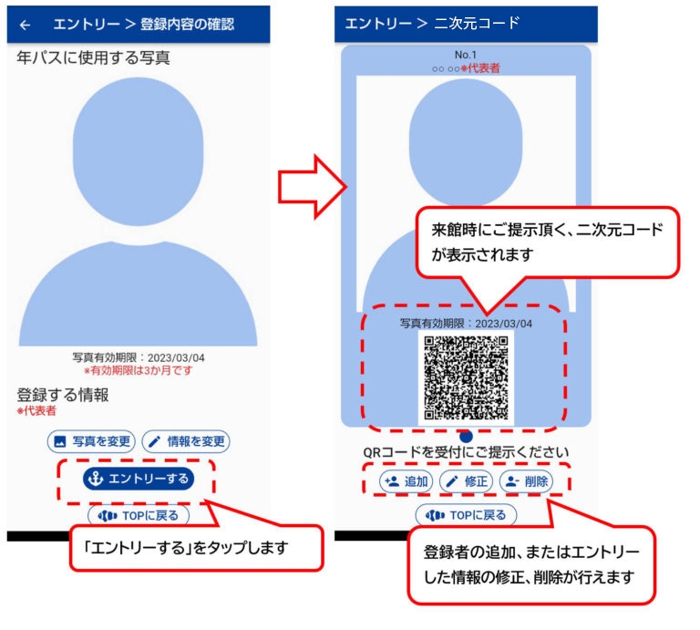エントリー完了後、ご来館の際に以下の流れで二次元コードをご提示ください。