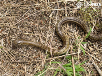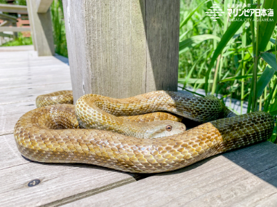 脊索動物門 爬虫綱 有鱗目 ナミヘビ科 英名:Japanese Rat Snake 全長100cmを超す日本本土では最大のヘビで、日本の固有種です。日本全国の平地から山地にかけて幅広く生息しています。体色は緑褐色です。 |
